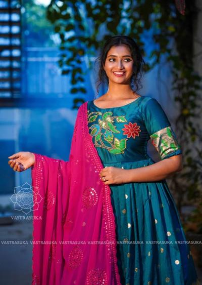 हे ड्रेसेस मुख्यत्वे शुद्ध रेशीम आणि जरतारी काठ वापरून तयार केले जाता. ज्यामुळे त्यांना एक राजेशाही लूक मिळतो.