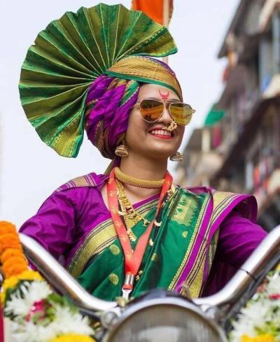 साडीच्या रंगाला साजेरा फेटा तयार करून घेऊ शकता. नऊवारी साडीवर फेटा घातल्यानंतर तुम्हाला रॉयल लूक मिळेल. सध्या उन्हाळ्याचे दिवस असल्यानं तुम्ही बाहेर पडताना साडीवर गॉगल लावू शकता.