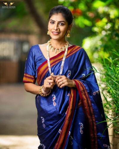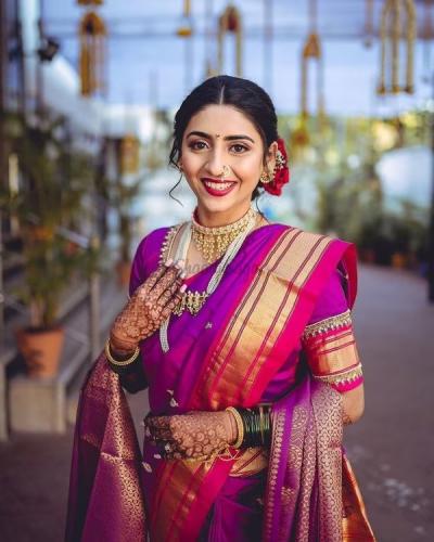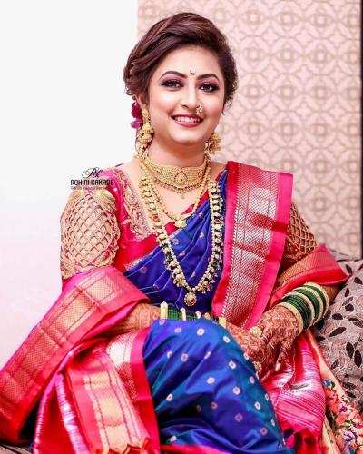 ब्लाऊजच्या रंगाला मॅचिंग बांगड्या तुम्ही निवडू शकता. गळ्यात चिंचपेटी किंवा कोल्हापुरी साज घालू शकता.