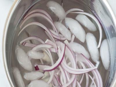 ८. एका बाऊलमध्ये थंडगार बर्फाचे पाणी घ्या, त्यात कांद्याच्या फोडी १५ मिनिटांसाठी ठेवा, नंतर कांदा चिरा. थंड पाण्यामुळे कांद्यामधील रसायने बाहेर पडण्यापासून रोखले जातात. ज्यामुळे कांदा चिरताना डोळ्यातून पाणी येत नाही.