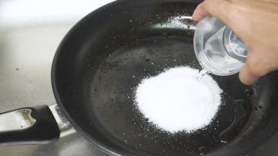 तव्यावर चमचाभर बेकिंग सोडा पसरवा आणि त्यावर थोडे व्हिनेगर घाला. बुडबुडे यायला सुरुवात होईल तेव्हा जुन्या टूथब्रश किंवा स्क्रबर घेऊन घासा. व्हिनेगरमधील अॅसिड आणि सोड्याची रासायनिक प्रक्रिया थर काढून टाकण्यास मदत करते.