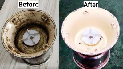 ग्राइंडरचा चिकटपणा घालवण्यासाठी आपल्याला ब्रशच्या मदतीने घासाव लागेल. त्यानंतर पाण्याच्या मदतीने धुवा, यामुळे भांड नव्यासारखं चमकेल.