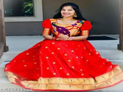आपण पैठणी साडी पासून असा सुंदर घेरदार घागरा - चोली देखील शिवू शकतो. पैठणीवर असणाऱ्या नाजूक छोट्या बुट्टीमुळे घागरा अधिकच आकर्षक दिसतो.