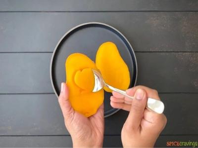 तुम्ही आंबा स्लाईस अँड स्कुप पद्धतीने देखील चिरु शकता. यासाठी सर्वात आधी आंबा कापून त्याच्या मोठ्या मोठ्या फोडी करून घ्याव्यात. त्यानंतर चमचा त्यात गोलाकार पद्धतीने रोवून त्याचे मध्यम आकाराचे स्कुप पाडून घ्यावेत.