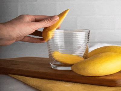या पद्धतीत तुम्ही आंबा चिरण्यासाठी स्टीलच्या ग्लासचा वापर करु शकता. यासाठी, सर्वात आधी आंबा नेहमीप्रमाणे कापून त्याची मोठी फोड ग्लासच्या कडेवर धरुन गर सालीपासून वेगळा करून घ्यावा.