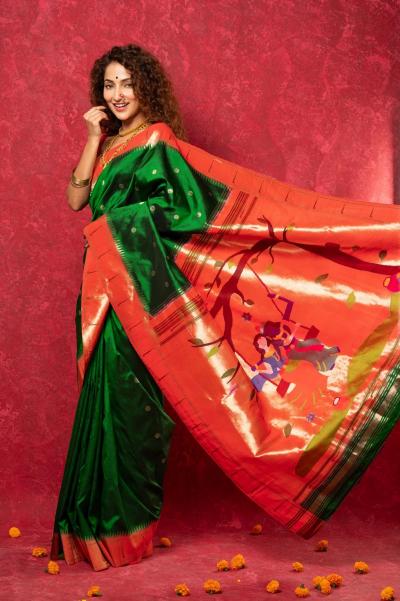 शुद्ध रेशीम पैठणीत दोन वेगवेगळ्या रंगाचे धागे वापरल्यानं प्रकाशानं साडीची छटा बदलल्यासारखी दिसते.