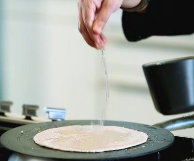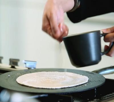 भाकरी दोन्ही हातांनी खालच्या बाजूनं उजून तव्यावर ठेवा किंवा तुम्ही उलथणीचा वापर करू शकता.