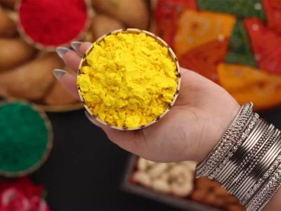 बेसन आणि हळद दोन्ही एकत्र करून घ्या. हे एकत्र केल्यानंतर तुम्हाला सुकलेला पिवळा रंग मिळण्यास मदत होईल. हे दोन्ही पदार्थ त्वचेसाठी फायदेशीर आहेत. हळदीमध्ये अन्टीसेफ्टिक गुणधर्म आढळून येतात. तर बेसन चेहरा स्वच्छ करण्यासाठी मदत करतं. तुम्हाला गरज असेल तर झेंडूची फुल पाण्यामध्ये उकळून पिवळा रंग तयार करू शकता.