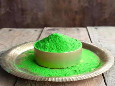 मिक्सरच्या भांड्यात पालक आणि कोथिंबीर घ्या. त्यात थोडे पाणी मिसळून मिश्रण वाटून घ्या. एका बाऊलमध्ये कॉर्नफ्लॉवर किंवा टॅल्कम पावडर घ्या. त्यात एक टेबलस्पून गुलाबपाणी मिक्स करा. त्यानंतर तयार पालक - कोथिंबीरची पेस्ट मिसळा. अशा प्रकारे हिरवा रंग तयार होईल.