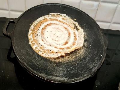 मीठ तव्याच्या पृष्ठभागावरील चिकटपणा दूर करण्यासाठी फायदेशीर ठरते. तवा मध्यम गरम करा. तव्यावर २ चमचे मीठ (शक्य असल्यास जाडे मीठ) टाका. या मिठाला मध्यम आचेवर २ ते ३ मिनिटे भाजून घ्या. मीठ बाजूला काढून घ्या आणि तवा कोरड्या कापडाने पुसून घ्या. आता त्यावर पाण्याचे थोडे थेंब शिंपडा. पाणी लगेच वाफ झाले, म्हणजे तवा डोसा करण्यासाठी तयार आहे.