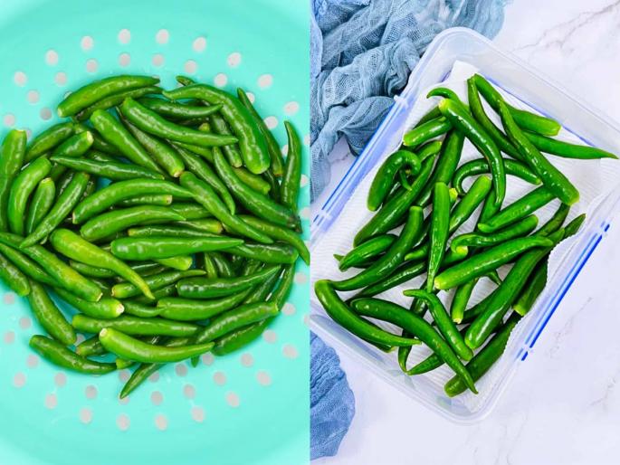 1 / 9जेवणात मिरचीशिवाय पदार्थाला चव येत नाही. अगदी फोडणी देण्यापासून ते पदार्थ झणझणीत करण्यासाठी हिरवी मिरची लागते. भाजी, डाळ किंवा चटणी बनवायची असेल तर मिरचीचा वापर केला जातो. (Keep green chilies fresh for long)2 / 9आपल्यापैकी अनेक गृहिणी आठवड्याभराचे सामान एकदाच आणतात. भाजीपाल साठवताना आपण अधिक काळजी घेतो. परंतु, हिरव्या मिरच्या आठवड्याभरात खराब होतात. फ्रीजमध्ये ठेवल्यानंतरही त्या सडतात किंवा सुकतात. ज्यामुळे आपण त्या फेकून देतो. (Kitchen hack to store green chilies)3 / 9जर आपल्यालाही हिरव्या मिरच्या साठवायच्या असतील तर या ६ सोप्या टिप्स कायम लक्षात ठेवा. (Cooking tips for storing green chilies)4 / 9हिरव्या मिरच्यांमध्ये नैसर्गिक ओलावा असतो. जर या योग्य पद्धतीने साठवल्या नाही तर ते कुजतात. प्लास्टिकच्या पिशवीत किंवा फ्रीजमध्ये ठेवल्याने त्यांना बुरशी लागते. बंद डब्यात ओली मिरची ठेवल्याने बॅक्टेरिया वाढतात, ज्यामुळे त्या लवकर खराब होतात. 5 / 9मिरच्या खरेदी केल्यानंतर त्या पाण्याने स्वच्छ धुवा. कापडावर पसरवून कोरडे होऊ द्या. त्याला ओलाव्या गेल्यानंतर साठवा. 6 / 9मिरचीचे देठ काढून मगच साठवा. यामुळे मिरची अधिक काळ टिकते आणि लवकर खराब देखील होत नाही. 7 / 9मिरच्या साठवण्यासाठी प्लास्टिकच्या डब्याऐवजी स्टील किंवा काचेच्या डब्याचा वापर करा. ज्यामुळे मिरच्या अधिक काळ टिकतील. 8 / 9मिरच्या हवाबंद डब्यात ठेवत असाल तर त्याच्या तळाशी स्वच्छ टिश्यू पेपर ठेवा. ज्यामुळे त्यातील ओलावा शोषून घेतला जाईल आणि मिरच्या फ्रेश राहातील. 9 / 9रेफ्रिजरेटरच्या तळाशी ज्या ठिकाणी आपण भाज्या ठेवतो त्या ठिकाणी मिरच्या ठेवा. जिथे तापमान स्थिर आणि थंड असेल. ज्यामुळे मिरच्या जास्त दिवस राहातील.