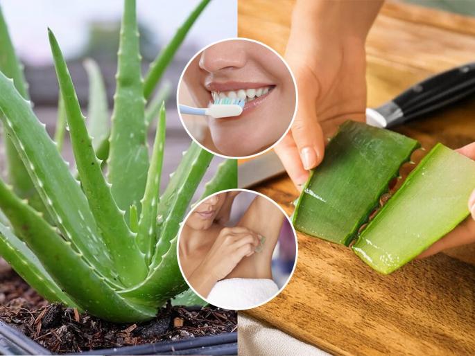 1 / 8त्वचेसाठी, केसांसाठी कोरफडीचा गर अतिशय उत्तम असतो, हे आपल्याला माहितीच आहे. पण त्याचा वापर नेमका कसा करावा ते समजत नाही. म्हणूनच या काही टिप्स..2 / 8पुढे सांगितलेल्या वेगवेगळ्या पद्धतीनुसार तुम्ही कोरफड वापरली तर केस, त्वचा निरोगी ठेवण्यासाठी इतर कोणतेच कॉस्मेटिक्स वापरण्याची गरज पडणार नाही.3 / 8जर भुवया पातळ असतील तर कोरफडीच्या पानांमधला ताजा गर आयब्रो ब्रशवर लावा आणि तो भुवयांवर फिरवून मसाज करा. भुवया दाट होतील.4 / 8कोरफडीचे पान मधोमध कापा आणि त्यावर थोडी हळद टाका. आता हा तुकडा काखेत फिरवा. ज्या लोकांना खूप घाम येतो, काखेमध्ये काळेपणा आलेला असेल किंवा अंगाला नेहमीच घामाची खूप दुर्गंधी येत असेल तर ती या उपायामुळे कमी होऊ शकते.5 / 8कोरफड वाळवून घ्या आणि त्याची पावडर करा. आता ही पावडर टुथब्रशला लावून त्याने ब्रश करा. हा उपाय केल्यामुळे दातांचा पिवळेपणा कमी होतो. तसेच हिरड्याही मजबूत होतात.6 / 8खोबरेल तेलामध्ये कोरफडीचा गर घालून ते उकळून घ्या. हे तेल केसांना लावा आणि अर्ध्या तासाने केस धुवून टाका. केसांचा कोरडेपणा जाऊन ते मऊ, सिल्की आणि चमकदार होतात.7 / 8कोरफडीचा गर लिपस्टिकच्या रिकाम्या बाटलीमध्ये घाला आणि फ्रिजमध्ये ठेवून तो घट्ट करून घ्या. आता ही स्टिक दररोज डोळ्यांभोवती फिरवा. डार्क सर्कल्स कमी होतील.8 / 8कोरफडीचं पान मधोमध कापा. त्यावर थोडी साखर आणि थोडी कॉफी पावडर घाला. आता हे पान तुमच्या चेहऱ्यावर चोळा. यामुळे टॅनिंग, डेडस्किन जाऊन त्वचा चमकदार होते.