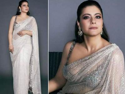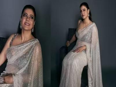 चंदेरी रंगांच्या जाळीदार चमचमत्या टिकल्यांच्या साडीत काजोलचे सौंदर्य फारच खुलून दिसत होते.