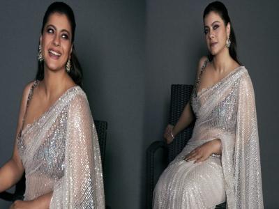 Kajol Looks Gorgeous In A Silvery Sequin Saree At Sidharth-Kiara's Wedding Reception : काजोलने परिधान केलेल्या चंदेरी रंगाच्या जाळीदार साडीमध्ये ती अजूनच उठून दिसत आहे.
