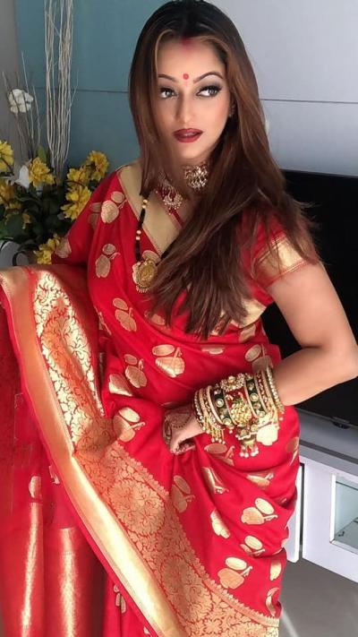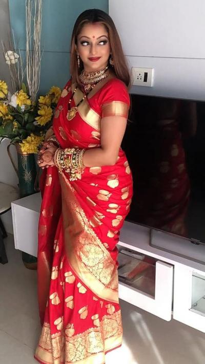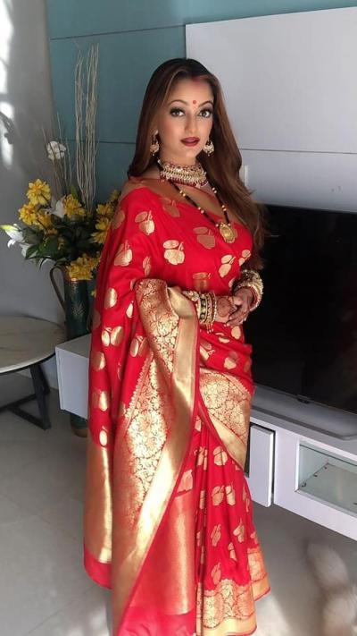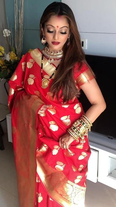 लाल साडीवरील गोल्डन काठांनी तिचं सौंदर्य आणखी खुलवलं आहे.