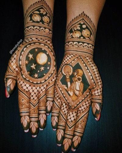 तुम्हाला हात भरून मेहेंदी काढायला आवडत असेल तर तुम्ही हातावर आपल्या पतीचं नाव लिहू शकता आणि त्या थिम रिलेडेट काहीही लिहू शकता.