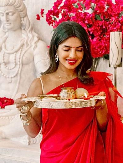 ६. अभिनेत्री प्रियांका चोप्रा हिचा मागच्या वर्षीचा हा करवा चौथ लूकही चांगलाच व्हायरल झाला होता. ट्रेण्डी आणि ट्रॅडिशनल अशा दोन्ही पद्धतीने ती नटली होती.