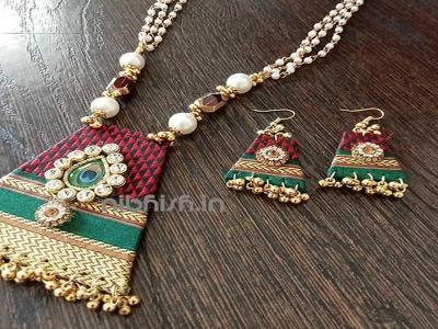 आपण अशा पद्धतीचे खणाच्या कापडाचे पेंडंट असलेला सुंदरसा नेकलेस साडी किंवा ड्रेसवर घालू शकता.
