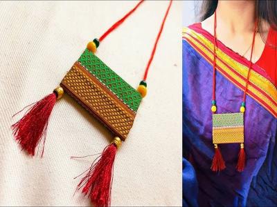 खणाचे कापड आणि या कापडाचा सुंदरसा असा काठ वापरुन असे नेकलेस पेंडंट तयार केलेले दिसत आहे. आपण अशा पॅटर्नचा लांब नेकलेस किंवा माळ साडीवर घालू शकता.