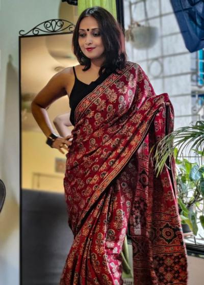 भारतीय साड्यांमध्ये अजरख प्रिंटेंड साड्यांची वेगळी ओळख आहे. गुजरात-राजस्थान सीमेलगत आणि कच्छ परिसरातून आलेली ही हातछाप कला आज फॅशनविश्वात नव्या अंदाजात पुन्हा एकदा ट्रेंड होत आहे. (Ajrakh printed saree)