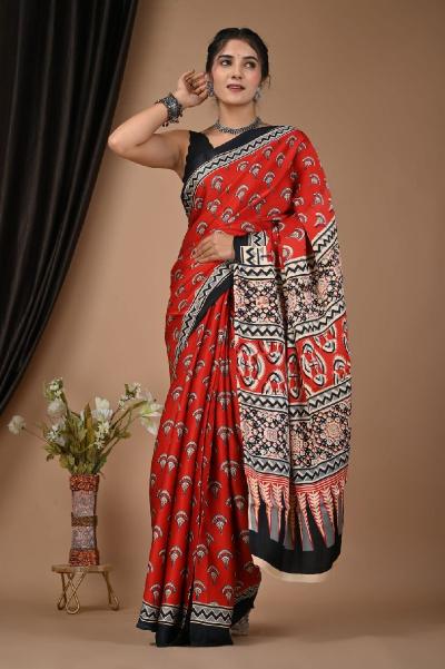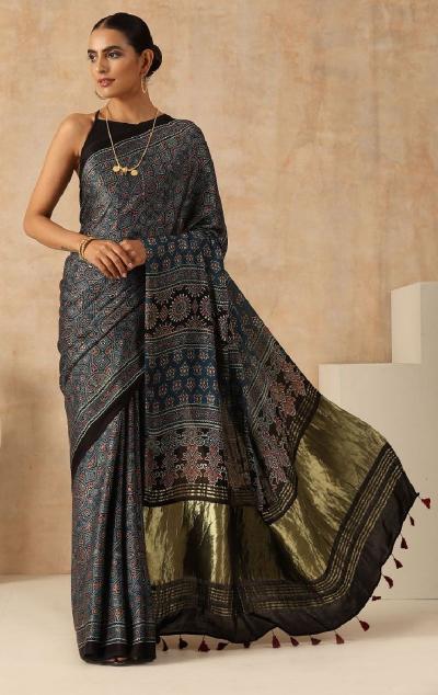 पार्टी, सण किंवा खास कार्यक्रमासाठी सिल्क अजरख साडी ही परफेक्ट आहे. यात आपल्याला रिच टेक्स्चर आणि डार्क रंग मिळेल. ज्यामुळे साडीला शाही लूक येतो.