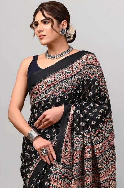 डेली वेअरसाठी आणि ऑफिससाठी कॉटन अजरख साडी हा चांगला पर्याय आहे. अतिशय कम्फर्टेबल असल्यामुळे वापरण्यासाठी बेस्ट आहे. साध्या ब्लाऊजसोबत ही साडी फारच एलिगंट दिसते.