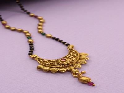 ३. चंद्रकोरचे पेंडंट असलेल मंगळसूत्र, पारंपरिक डिझाईन्समध्ये अधिक सुंदर दिसते, ज्यात चंद्रकोरीला सोन्याच्या नाजूक कलाकुसरीने सजवले आहे. `