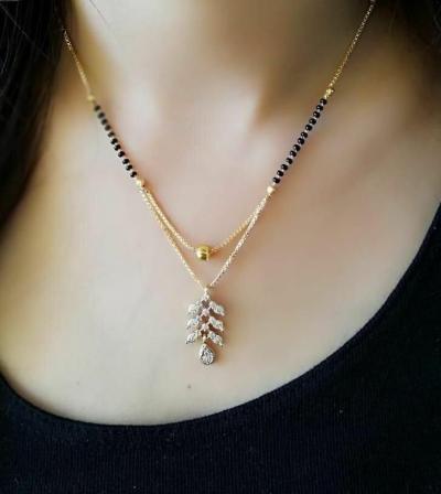 मंगळसूत्रामध्ये काळेमणी आणि दोन सोन्याची चेन. एकात छोटा सोन्याचा मणी तर मध्यभागी डायमंड पानाची डिझाइन पाहायला मिळेल.