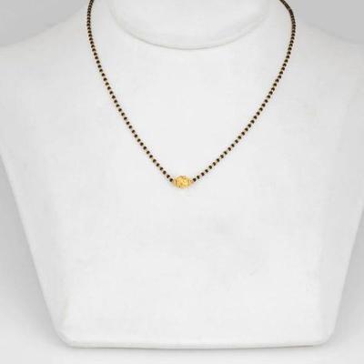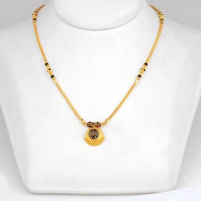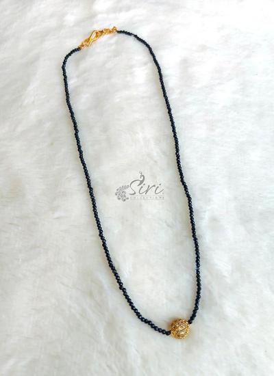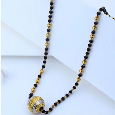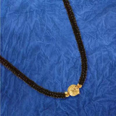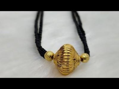 मोठा गोल मणी त्यावर चंदेरी रंगाची डिझाइन आणि काळ्या- सोन्याच्या छोट्या मणीने ओवलेल हे मंगळसूत्र नववधुच्या सौंदर्यात भर घालेल.