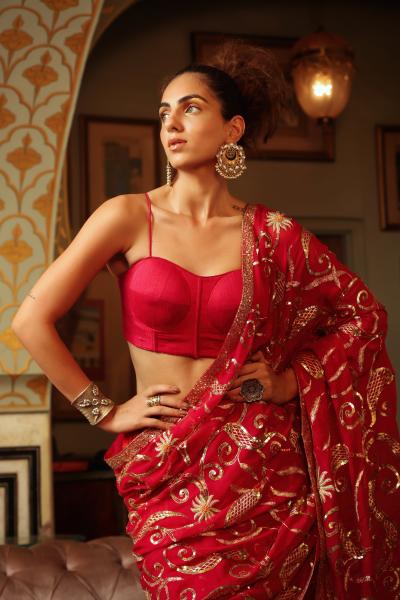 सध्या हो कोरसेट ब्लाऊज (corset blouse) खूप ट्रेण्डमध्ये आहे. या डिझाईनमध्ये नुसता बेल्टच आहे. पण तुम्ही त्याऐवजी तुमच्या नेहमीच्या पद्धतीने शोल्डर आणि बाह्या घेऊ शकता.
