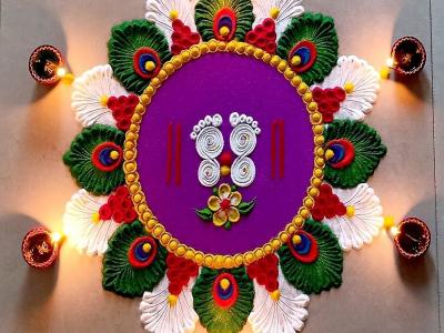 कमळाची रांगोळी तुम्ही काढू शकता. कमळ हे लक्ष्मी देवीचं आसन आहे. चमच्याच्या किंवा बांगडीच्या मदतीनं तुम्ही पाकळ्यांचा बाह्य आकार सहज काढू शकता.