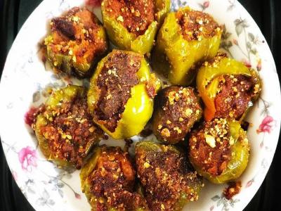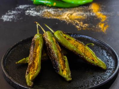 ४. बाजारात अनेक प्रकारच्या मिरच्या मिळतात. त्यामध्येच एक जाड व पोपटी रंगाची मिरचीही मिळते. त्याच मिरचीचा वापर करून भरली मिरची तयार करता येते.
