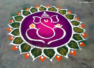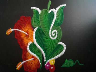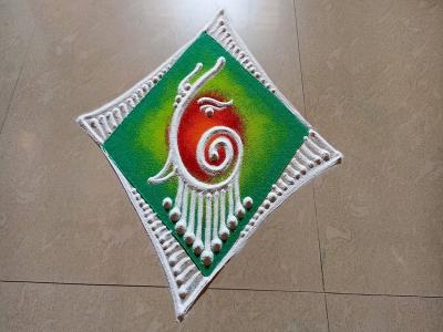 पानांचा आकार देऊन काढलेली गणरायाची ही आणखी एक सुरेख रांगोळी. ही रांगोळी दिसायला अवघड वाटत असली तरी काढायला खूपच सोपी आहे.