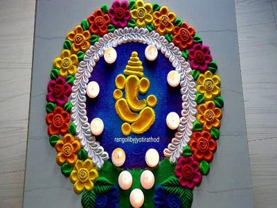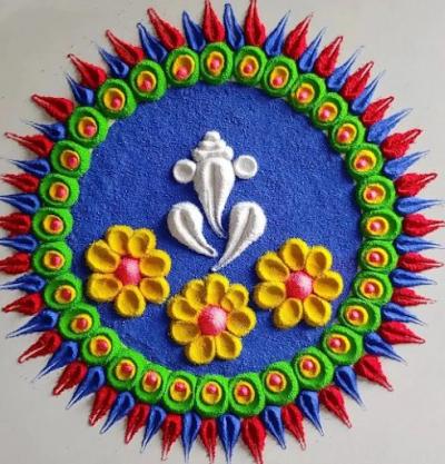 कमी जागेत काढता येण्यासारखी ही आणखी एक रांगोळी. या रांगोळीतील गणपती आणि त्याच्या आजुबाजुची फुलं खूप नजाकतीने काढण्यात आली आहेत. त्यामुळे रांगोळी आकाराने लहान असूनही खूपच भरीव आणि लक्षवेधी वाटते.