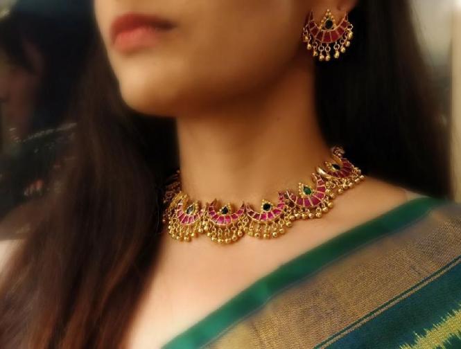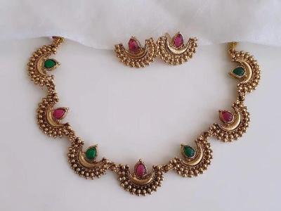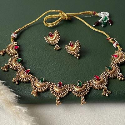 हिरव्या आणि लाल खड्यांनी सजवलेली चंद्रकोर हा एक 'एव्हरग्रीन' प्रकार आहे. जर तुमच्या साडीचे काठ हिरवे किंवा लाल असतील, तर हा नेकलेस तुमच्या साडीला उत्तमरित्या मॅच होतो.