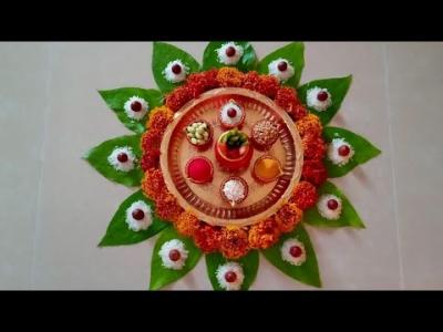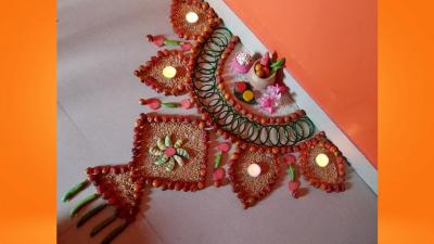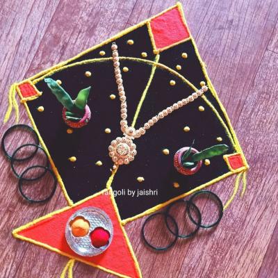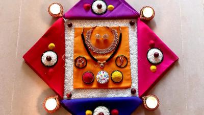 वेगवेगळे दागिने आणि ओटीचं सामान वापरून अशी सुरेख रांगोळी काढता येते. पाहताक्षणीच सगळ्यांना ती नक्की आवडेल.