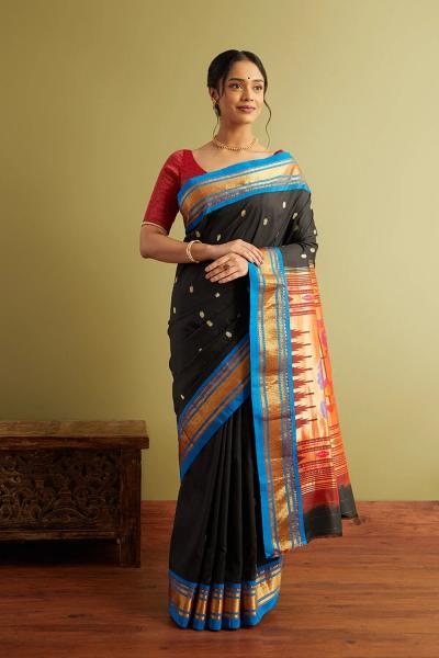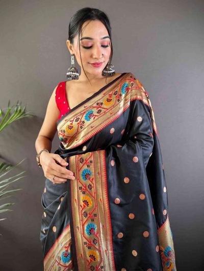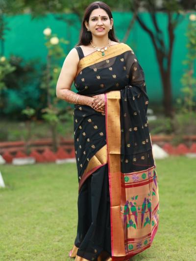 काळ्या रंगाच्या पैठणीवर जेव्हा सोनेरी जर आणि नाजूक बुट्टी येते तेव्हा तिचे सौंदर्य अधिकच खुलून येते.