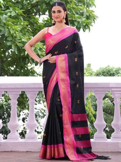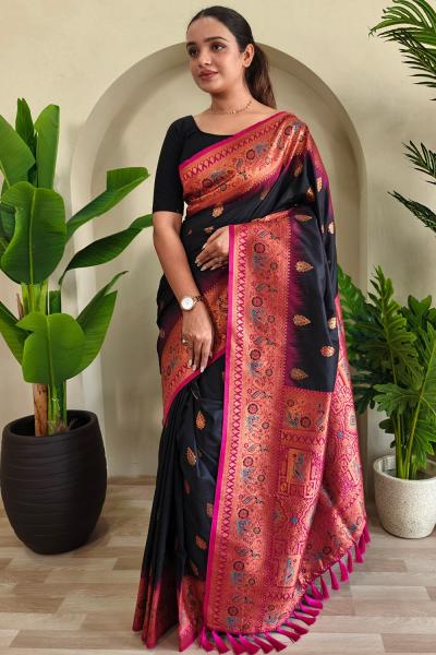 काळ्या पैठणीला गडद गुलाबी, पोपटी किंवा लाल रंगाचे काठ असतील तर ती अधिकच उठावदार दिसते.