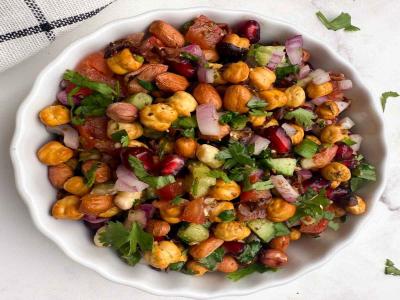 उकडलेले काबुली चणे, टोमॅटो, काकडी, कांदा, कोथिंबीर आणि थोडा लिंबू रस मिसळून झटपट सॅलेड तयार होतं. त्यात काळं मीठ आणि थोडं चाट मसाला घातल्याने चव अधिक छान लागते.