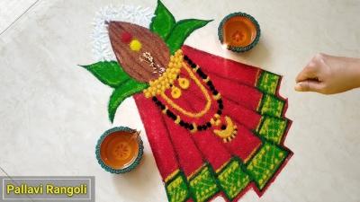 या रांगोळ्यांमध्ये प्रामुख्यानं कमळ, कलश, स्वातिस्क, शंख,दिवा यांसारख्या शुभ चिन्हांचा वापर केला जातो.