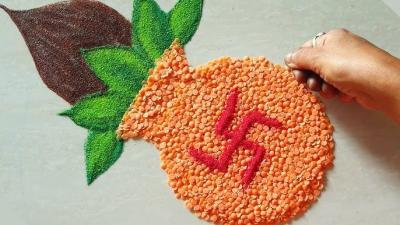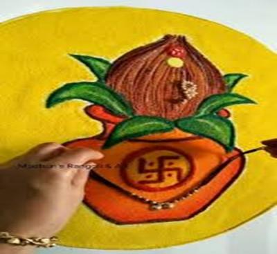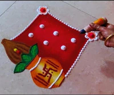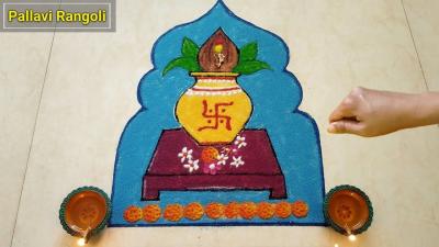गुरुवारी पुजेच्या दिवशी तुम्ही मुख्य दरवाजाजवळ अशा पद्धतीची कलश रांगोळी काढू शकता. ही रांगोळी दिसायला अवघड असली तरी काढायला अगदी सोपी आहे.