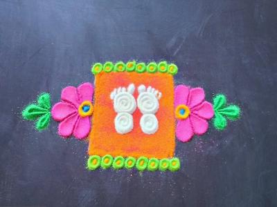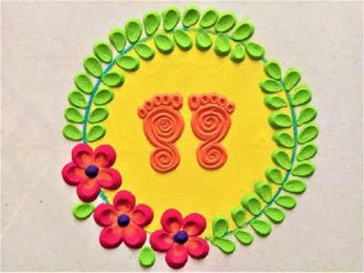 देवीसमोर रांगोळी काढताना कमी वेळात छान रांगोळी काढायची असेल तर देवीची पाऊलं काढणं हा सर्वात सोपा उपाय असतो.