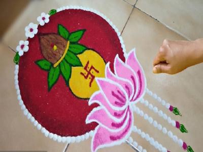 तुमच्याकडे थोडा वेळ असेल आणि देवीच्या पुजेसमोर बऱ्यापैकी जागा असेल तर कमळ आणि त्यावर कलश असे देवीचे रुप तुम्ही रांगोळीच्या माध्यमातून दाखवू शकता.