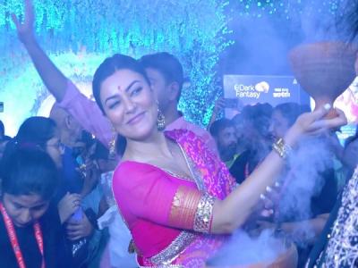 बंगाली ब्यूटी सुश्मिता सेन तिच्या दोन्ही मुलींसोबत दुर्गापुजेला गेली होती. त्यावेळी तिने गुलाबी रंगाची सुंदर बांधणी साडी नेसली होती. तिथे तिने हातात धुनी घेऊन पारंपरिक धुनूची नृत्यही केले.