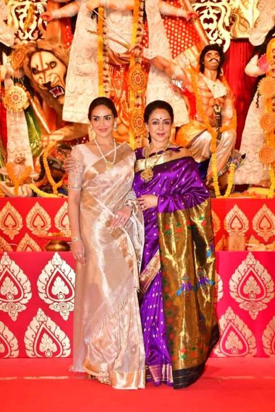 ड्रिम गर्ल हेमामालिनी कन्या इशा देओल हिच्यासोबत दुर्गा पुजेला गेल्या होत्या. यावेळी हेमा यांनी जांभळ्या रंगाची रेशमी पैठणी नेसली होती. तर इशाने सोनेरी रंगाची साडी नेसली होती.