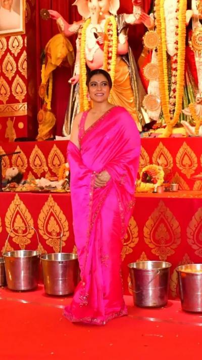काजोलनेही यंदा दुर्गापुजेसाठी चमकदार गुलाबी रंगाची साडी नेसली होती. काजोलही दुर्गापुजा सहसा कधीच चुकवत नाही.