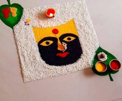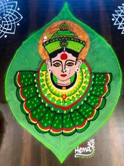 या रांगोळीत तुम्ही देवीची विविध आभुषणे, वस्त्र, शस्त्र यांची रांगोळी काढू शकता.