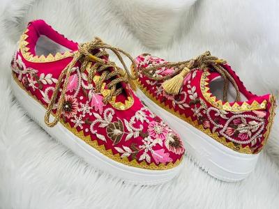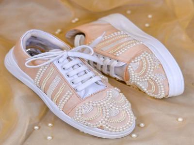 ६. या स्नीकर्स शूजमध्ये काही पेस्टल शेड्स देखील विकत मिळतात. आपल्या घागरा - चोली जर पेस्टल शेडचे असे आणि त्यावर मोती वर्कचे डिझाईन असेल तर आपण अशा प्रकारचे मोती वर्क असणारे शूज घालू शकता.