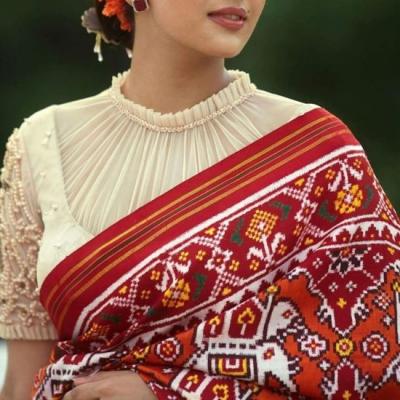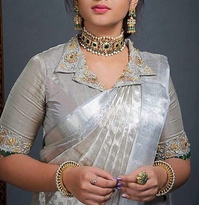 कॉलरच्या ब्लाऊजला प्रिसेंस कटचं पॅटर्न जास्त शोभून दिसेल. साडीचा पदर सोडल्यास चांगला लूक येईल.