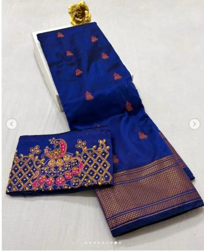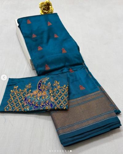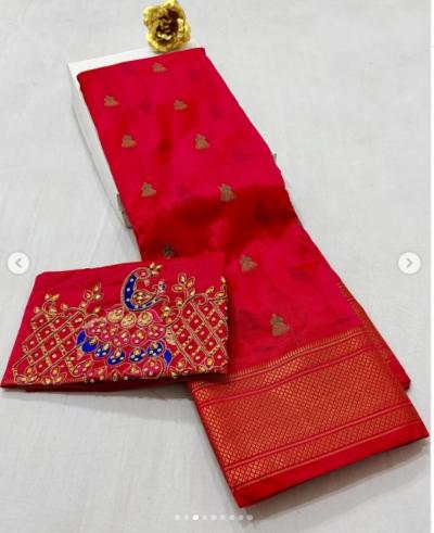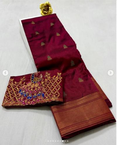 या साडीवर मोठे काठ आणि साडीभर लहान नाजूक बुट्ट्यांचे काम असते जे साडीला एक रिच लूक देते.